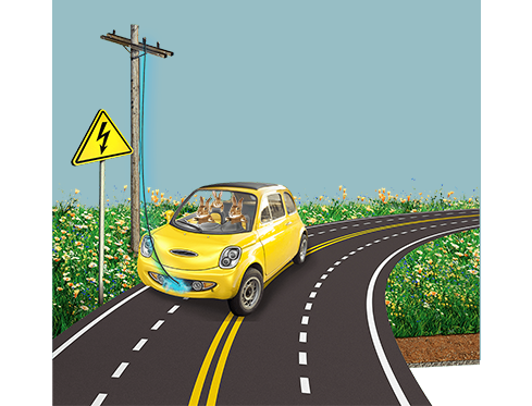 If you’re in your vehicle and a power line falls on top of it, stay inside your vehicle and call 9-1-1. Leave immediately if there’s a fire. To get out safely, do the “bunny hop” – jump out of your vehicle with both feet together so that you don’t touch the ground and the vehicle at the same time.